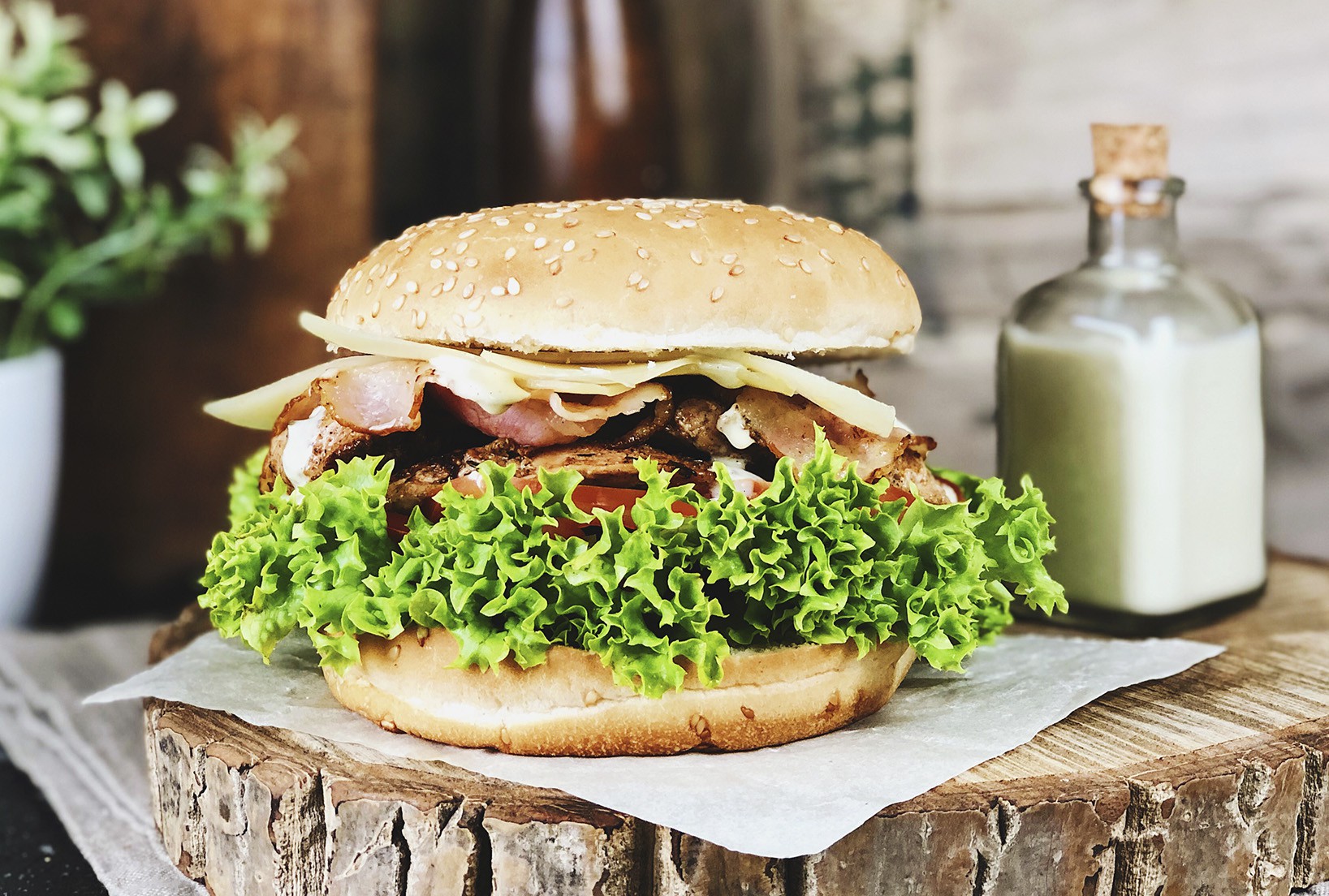 Булочка з кунжутом, куряче філе, бекон, помідор, лист салата, сир Пармезан, соус Цезар